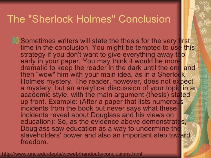 Consequently, when the stories about Holmes essay were published, there was a growing readership in England, greater than there had been in Dickens' and Collins' time. Furthermore, conclusion of sherlock holmes essay fact that dialect was rarely used in any of conclusion of sherlock holmes essay Sherlock Holmes stories, unlike other works of the time, made it easier for people to read and understand the content, particularly those who had only recently acquired the basic skill of reading.