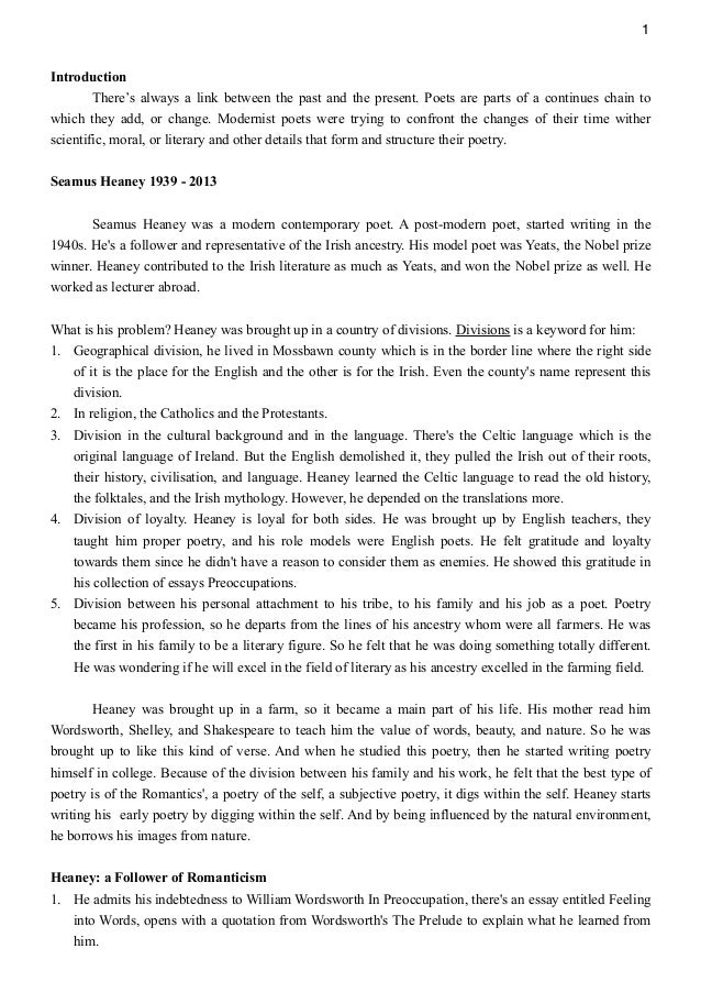 Speaking about the poets of the th, Seamus Heaney, an Irish poet and a Nobel Prize winner was, maybe, one the best known authors. Born in near Castledawson, County Derry, Heaney was the eldest of nine children of a Catholic farmer and cattle-dealer. Need essay sample on.